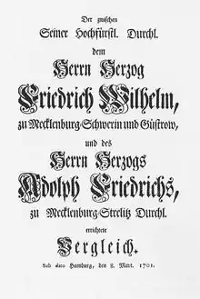 The Treaty of Hamburg (German - Hamburger Vergleich or Hamburger Erbvergleich) was a dynastic house law of the House of Mecklenburg. Heavily influenced by representatives of the Lower Saxon Circle, it was agreed on 8 March 1701 in neutral Hamburg. It ended the dispute over the inheritance of the Mecklenburg-Güstrow caused by the death of Gustav Adolph, Duke of Mecklenburg-Güstrow without a male successor in 1695 and established the duchies of Mecklenburg-Strelitz and Mecklenburg-Schwerin.