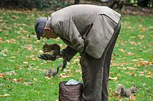 Tree squirrels are a common type of urban wildlife.[22] They can be trained to be hand-fed and will take as much food as is available because they cache the surplus. Squirrels living in parks and campuses in cities have learned that humans are typically a ready source of food. Urban squirrels have learned to get a lot of food from generous or unknowingly 'careless' humans. Humans commonly offer various nuts and seeds; however, wildlife rehabilitators in the field have noted that neither raw nor roasted peanuts nor sunflower seeds are healthy for squirrels, because they are deficient in several essential nutrients. This type of deficiency has been found to cause metabolic bone disease, a somewhat common ailment found in malnourished squirrels.[23][24]