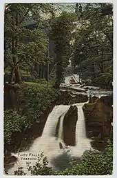 The Fairy Falls, a waterfall on the river Crafnant, was a popular visiting place. Downstream of the main falls are a number of further, lesser, falls, which old postcards also call the "Fairy Falls". Along this lower section of river the water once turned a number of waterwheels which powered various mills. The whole area of this series of falls—from the main falls through the lesser falls downstream—was known as "Fairy Glen", and was altogether more free from trees and vegetation than it is today. In Edwardian times there was a proper path alongside the river Crafnant, and a popular stroll was to walk from the banks of the river Crafnant, up through the well-known Fairy Glen, and on beside the river Crafnant up towards Llyn Crafnant.[20]
