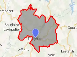 Treignac is a commune located in the Massif Central on the Plateau de Millevaches. The village is built between 400 and 500 metres above sea level, at the foot of the Massif des Monédières, in the gorges of the Vézère river, at the gates of the Parc naturel régional de Millevaches en Limousin (Regional Natural Park of Millevaches in Limousin). The site is limited to the west by the Rocher des Folles and to the east by the Saut de la Virolle.