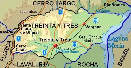 Treinta y Tres (Spanish pronunciation: [ˈtɾejnta i ˈtɾes]) is a department of Uruguay. Its capital is Treinta y Tres. It is located in the east of the country, bordering the departments of Cerro Largo to the north, Durazno and Florida to the west, Lavalleja and Rocha to the south, while to its east is the lake Laguna Merín separating it from the southernmost end of Brazil.
