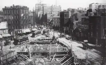 The Tremont Street subway runs underneath the street. Opened in 1897, it was the first subway tunnel in North America and still carries the MBTA Green Line.