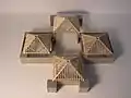 From a design perspective, the bath house actually appears as a simple cruciform—four square concrete block rooms or areas, surrounding an open atrium. Each of the rooms is topped by a simple, wooden rectangular pyramid. At the corner of each room there is a large, open rectangular column that supports the roof. However, closer inspection reveals that in addition to the pure design elegance, Kahn also clarified his thinking about the utilitarian purposes of the various spaces, and it was in this building that he first articulated his notion of spaces serving and spaces served.