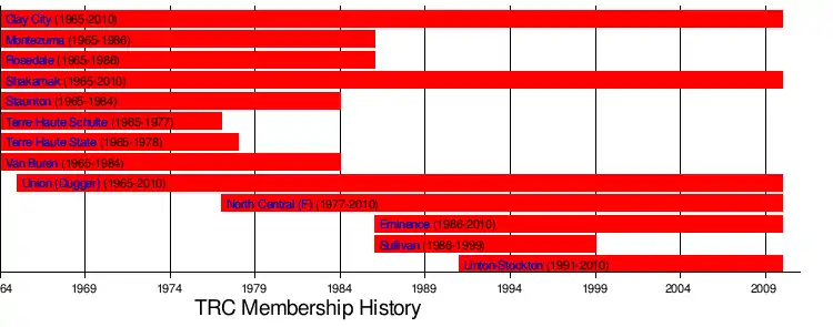 The Tri-River Conference, established around 1965, was a seven-member IHSAA-sanctioned conference located within Clay, Greene, Morgan, and Sullivan counties in Indiana. It was named for the southern Eel, White, and Wabash rivers which flow through the territory of the conference. Clay City, Linton Stockton, Shakamak, and Union (Dugger) high schools also participated in the Southwestern Indiana Conference at the same time. The conference disbanded at the end of the 2009-2010 school year.[1]