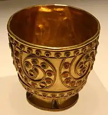 The Trialeti-Vanadzor culture was known for its particular form of burial. The elite were interred in large, very rich burials under earth and stone mounds, which sometimes contained four-wheeled carts. Also there were many gold objects found in the graves.[13] These gold objects were similar to those found in Iran and Iraq.[9] They also worked tin and arsenic.[17] This form of burial in a tumulus or "kurgan", along with wheeled vehicles, is the same as that of the Kurgan culture which has been associated with the speakers of Proto-Indo-European. In fact, the black burnished pottery of especially early Trialeti kurgans is similar to Kura-Araxes pottery.[18] In a historical context, their impressive accumulation of wealth in burial kurgans, like that of other associated and nearby cultures with similar burial practices, is particularly noteworthy.[19] This practice was probably a result of influence from the older civilizations to the south in the Fertile Crescent.[20]