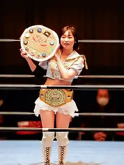 Riho was the first champion in the title's history.[1] Neko Nitta holds the record for most reigns, with six.[5][6][7][8][9][10] Nitta also holds the records for both the shortest, at 11 days, and the longest, at 389 days, reigns in the title's history. Overall, there have been forty-three reigns shared among twenty-eight wrestlers. Maika Ozaki is the current champion in her first reign.