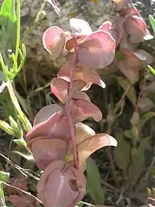 Tricardia is a monotypic genus of flowering plants in the borage family containing the single species Tricardia watsonii, which is known by the common name threehearts.[1] It is native to the southwestern United States, where it grows in deserts and mountains in sandy open habitat, often beneath shrubs. It is a perennial herb growing from a taproot and a woody caudex covered with the shreddy remains of previous seasons' herbage. It produces several erect stems up to about 40 centimeters tall. Most of the leaves are located in a basal rosette about the caudex. They are lance-shaped and coated thinly in woolly hairs. They are up to 9 centimeters long and are borne on petioles. A few smaller leaves occur higher on the stem. Flowers occur in a loose cyme at the top of the stem. Each has a calyx of five sepals. The outer three are heart-shaped and green to pink or purple in color, and the inner two are much smaller and narrower. The flower within is bell-shaped, white with central purple markings, and roughly half a centimeter wide. The fruit is a capsule just under a centimeter long which contains 4 to 8 seeds.