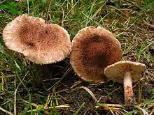 The cap of T. vaccinum is initially broadly conical, then convex and finally flattened; its diameter is usually between 2.5 and 8 cm (1 and 3 in).[15] The cap margin is initially curved inwards, and shaggy from hanging remnants of the partial veil. The partial veil is cotton-like, and does not leave a ring on the stipe. The fibrous to scaly cap surface ranges in color from reddish-cinnamon to brownish-orange to tan. The gills have an adnate to sinuate attachment to the stipe, and are crowded closely together. There are between three and nine tiers of lamellulae—short gills that do not extend completely from the cap edge to the stipe. The gills are dingy white, and frequently stain reddish brown. The stipe is 3 to 8 cm (1 to 3 in) long and 1 to 2 cm (0.5 to 1 in) thick, and becomes hollow in age.[15] It is roughly equal in width throughout its length and ranges in color from whitish to the same color as the cap, but lighter, and sometimes with reddish-brown stains; it is lighter in color near the apex. Like the cap, the stipe surface is fibrous to scaly.[16] The odor of the fruit bodies is unpleasant.[17]