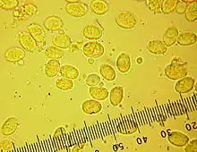 The spore print is white. Spores are elliptic (or narrowly so), and measure 8–12 by 4.8–6.2 µm. There are clamp connections present in the hyphae.[7] The basidia (spore-bearing cells) are four-spored, club-shaped, and measure 23–30 by 8–10 µm. The hymenium lacks cystidia. The cap flesh comprises homogenous, interwoven hyphae that are 3–5 µm in diameter, while the cap cuticle is a 200–300-micrometer thick layer of interwoven, gelatinous hyphae up to 4 µm in diameter.[2]
