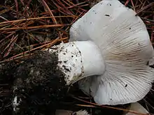 When collected in its typical habitat and during the appropriate season, Tricholoma vernaticum mushrooms can be readily identified because of their prominent characteristics: white color, stocky fruit body, farinaceous odor, and ring on the stipe. Tricholoma lookalikes in the same geographic region grow at lower elevations, typically in autumn. T. portentosum has a gray cap, a stipe with yellow tints, and lacks a ring, while T. mutabile has violet tones in its cap and also lacks a ring. Other lookalikes include Hygrophorus subalpinus and H. camarophyllus, but these species have broad, waxy gills, and lack the characteristic odor of T. vernaticum.[7]