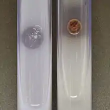 In preparing samples for diagnosis, a scraping of the skin from the active border of infection is taken, and is inoculated directly onto the test medium.[1] Trichophyton verrucosum is auxotrophic for inositol and thiamine, and as such can be distinguished from other dermatophytes by observing strong growth on Trichophyton agar 3 (a medium rich in thiamine and inositol) and none to weak growth on Trichophyton agars 1 and 2 (deficient in these nutrients).[19] It will also grow on Sabouraud agar, but only with the addition of yeast extract (which provides the inositol and thiamine it requires).[1] In Bromocresol purple (BCP) milk solids glucose agar, a medium used to distinguish the dermatophytes from bacteria and other organisms by evaluating ammonium production during proteolysis, T. verrucosum produces a weakly alkaline result (faint purple) and clearing of milk solids with a characteristic halo on the periphery. Negative test results occur for the urease test, hair perforation test, and casamino acids erythritol albumin agar.[5] In conjunction to physiological tests, contact with cattle should also be used as a criterion due to the zoophilic and occupational nature of the disease.[20] Otherwise, misdiagnosis as pyoderma or bacterial folliculitis can occur, with the prescribed antibacterial treatment having no effect.[16] Indeed, one study found that people infected with T. verrucosum had to visit a physician on average of 2.5 times, with 25 days elapsing, before a proper diagnosis was obtained.[20] This may lead to an underestimation of the true number of cases, as many people will recover from the disease before obtaining a proper diagnosis.[16] Looking at the stratum corneum under a microscope may also aid in diagnosis, which is done by adding 10% KOH solution and a Periodic acid-Schiff stain. Swollen chlamydospores 5-10 μm in diameter will appear outside the hair shaft, while skin samples will have swollen spores mixed with dermatophyte filaments.[1][2][5]