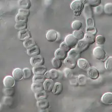 Trichophyton verrucosum is very slow-growing compared to other dermatophytes.[4] In culture, it is characterized by being flat, white/cream colour, having an occasional dome, with a glabrous texture, known as the variant album, however other variations are also found: T. verrucosum var. ochraceum has a flat, yellow, glabrous colony; T. verrucosum var. discoides has a gray-white, flat, and tomentose colony; and T. verrucosum var. autotrophicum is rarely seen and is associated with sheep.[5][6] Under a microscope, macronidia are rare, and have a rat-tail or string bean shape, while micronidia are tear-shaped and have been only observed in laboratories when grown under enriched conditions.[7] It lacks a teleomorph (sexual) stage.[5] At 37 °C (the only dermatophyte with an optimum growth temperature this high),[7] chlamydospores become thick-walled and found in long chains.[6] Macronidia are more commonly produced on BCP-milk solids-yeast extract agar, and only on colonies over 7 days old.[5] Under refrigeration, it will die.[7] Regions infected with T. verrucosum will fluoresce under a blacklight in cattle, but not in humans.[6]