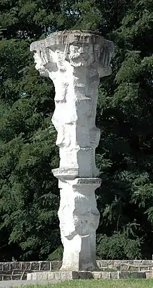 Triglav is depicted as a three-headed man sometimes with bands of (gold) blindfolds over his eyes, or a man with three goat heads. Several temples dedicated to Triglav existed near present-day Szczecin, Poland. The Polish village of Trzygłów (German: Trieglaff) is where, according to Johannes Bugenhagen in his Pomerania (1517), an image of Triglav was buried in the village to protect it from the priests of Otto of Bamberg in the 1120s.[4] During the period of Christianization, such temples and statues of Triglav were generally completely destroyed.
