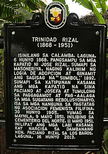 National Historical Commission of the Philippines marker honoring Trinidad Rizal, located in Los Baños, Laguna.