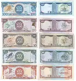 On 14 December 1964, the Central Bank of Trinidad and Tobago introduced notes for $1, $5, $10 & $20.[21] New denominations in the form of $50 & $100 notes were issued on 6 June 1977, although the $50 note was not continued after a shipment was stolen prior to issue. The $50 note was taken out of its brief circulation. The reverses of the current notes feature the Central Bank Building of Trinidad & Tobago. The obverses have the coat of arms in the center, a national bird and a place in Trinidad, such as a market, petroleum refinery, etc. In 2002, new $1 & $20 notes were introduced. In 2003, new $1, $5, $10 & $100 were also introduced. The notes were only slightly changed; they now have more security features & darker colour. Recently, more security features have been added to the notes by the Central Bank of Trinidad and Tobago. In 2012 the $50 note was reintroduced to commemorate Trinidad and Tobago's Golden Jubilee of Independence. On the front of the note is a Red-capped cardinal bird and the commemorative text around the center of the coat of arms.[22] Two versions of this denomination were released, one without the commemorative text around the centre of the coat of arms (general circulation) and one with the commemorative text.