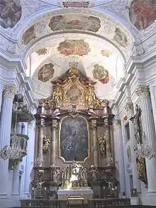 Important works by Cosmas Damian Asam (ceiling paintings in the dome), Joseph Ruffini, Andreas Faistenberger, Johann Baptist Straub and Johann Georg Baader can be admired inside. The spire which lost its steepletop in World War II is situated further north next to the former convent.