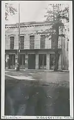 The first courthouse was completed in 1853 as a three-storey wooden building at the intersection of Court and Church streets in the county seat of Weaverville. It had a footprint of 20 by 60 feet (6.1 m × 18.3 m). The third storey was purchased by the Trinity Masonic Lodge for US$500.[3] The 1853 Weaverville courthouse was condemned in an 1860 grand jury report, which found that "bed bugs had invaded the offices of the sheriff and the clerk, had defiled the records, and had even attacked a judge on the bench", prompting local officials to move.[4]