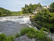 Triphammer Falls is a 55-foot (17 m) waterfall on Fall Creek in Ithaca, New York, located within the campus of Cornell University.[1] The waterfall existed naturally but was altered substantially in order to construct a dam in the 19th century, leading to the formation of Beebe Lake.[2] The dam is capable of regulating the water flow between 12–4,700 cubic feet (0.34–133.09 m3) per second.[3] In 1997, a pedestrian bridge was built over Triphammer Falls to connect Central and North Campus.[1]