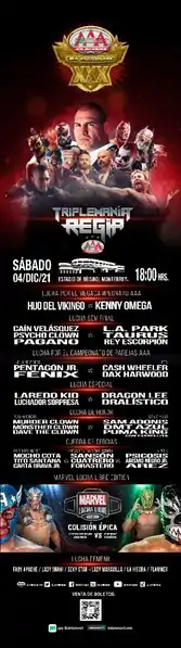 Triplemanía Regia II[1] was a professional wrestling pay-per-view event that was promoted and produced by the Mexican professional wrestling promotion Lucha Libre AAA Worldwide (AAA). The event was originally scheduled to take place on October 10, 2020 but was postponed and later cancelled on November 30 due to the COVID-19 pandemic. However, on October 18, 2021, AAA announced that the event would be occurring on December 4 at the Estadio de Béisbol Monterrey in Monterrey, Mexico.[2] It marked the 29th year in a row that AAA has held a Triplemanía show, and the 36th overall show held under the Triplemanía banner since 1993. The annual Triplemanía show is AAA's biggest event of the year, serving as the culmination of major storylines in what has been described as AAA's version of WrestleMania or their Super Bowl event. The event aired on PPV via FITE TV in the U.S. and in Mexico on Space and TV Azteca.
