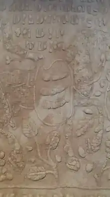 The imagery on the quilt resembles the narrative of chapters 17–19 of a 14th-century novella, La Tavola Rotonda o L'Istoria di Tristano, which describes the oppression of Cornwall by Languis of Ireland and his champion Amoroldo (a variation on "Morholt"), and the battle of Tristan on behalf of King Mark of Cornwall.[2] The foliage on the quilt includes ivy and grape vines, a reference to the plants that grew and intertwined from the tombs of the doomed Tristan and Isolde.[2] The scenes on the V&A quilt are not in their original order, having been re-arranged at some point.[2] Each scene has a caption in the Sicilian language.
