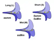 This incompatibility system is a specific mechanism employed by heterostylous species, where incompatibility is based on the positioning of the reproductive structure of the flower. In tristylous species this is based on two loci, S and M with one allele dominant at each loci.[1] For the short-styled morph the dominant allele is in the S locus (Ssmm or SsMm), whereas in the mid-styled morph the dominant allele is at the M locus (ssMm). The S locus is epistatic to the M locus such that the presence of the S allele produces a short-styled flower regardless of the genotype at the M locus. The long-styled morph, on the other hand, is homozygous recessive for both loci (ssmm).[4]