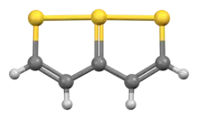 Trithiapentalene is an organic bicyclic molecule containing two sulfur heterocycles. Its 10-π aromatic structure is similar to naphthalene. There has been a literature dispute about whether the connectivity among the three sulfur atoms is a case of rapid tautomerization between two valence tautomers or a 3-center 4-electron bond.[2]