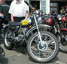 Based on the Speed Twin, the TR5 was a trials machine designed for off-road use with a high level two into one exhaust and good handling on public roads.[2] The name 'Trophy' came from the three 'specials' that Triumph built for the Italian International Six Day Trial in 1948, which went on to win three gold medals and the manufacturers team trophy.[3] Racing in American Motorcyclist Association (AMA) Class C until 1969, the American export models included components from the Tiger 100 to create a motorcycle for desert competition.[4]