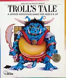 Troll's Tale is an adventure video game developed in by Sunnyside Soft and published by Sierra On-Line for the Apple II in 1983. It uses the same engine for Sunnysoft's earlier game Dragon's Keep.[2] Sierra acquired the game from Sunnysoft, along with Dragon's Keep and Bop-A-Bet by April 1983[1] and appointed Nancy Anderton to manage the publishing of their educational games.[3] Peter Oliphant converted the games for the Atari 8-bit family, Commodore 64 and, as a self-booting disk, IBM PC compatibles.[4] Coleco made a deal with Sierra[5] planning to release the game on ColecoVision with a Super Game Module.[6] The game came packaged with a paper map, showing an incomplete layout of the game and stickers to mark the treasure locations.[7]