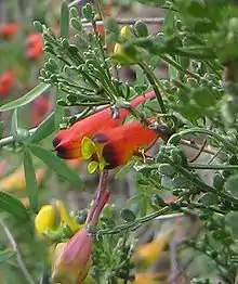 Tropaeolum tricolor is a summer-dormant climber which flowers from winter to spring.[2] It has thin, straggly stems growing from a reddish coloured root tuber and extending up to 2 or 3 metres (6 ft 7 in or 9 ft 10 in). The leaves are peltate (with the stalk in the centre), nearly circular with five or six deeply cut lobes. The numerous flowers are borne singly on long wiry stalks growing from the axils of the leaves. They are narrowly funnel-shaped and about 3 centimetres (1.2 in) long. The five sepals are red, orange or yellow tipped with a purple band, and extending backwards in a red spur. The small, greenish-yellow rounded petals have a clawed base. The sepals turn brown after the flowers fall and enclose the two or three, dark brown seeds.[1]