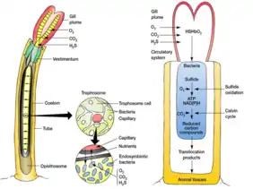 The host lacks entirely a digestive system but derives all the essential nutrients from its endosymbiont . The host in turn provides the endosymbiont with all necessary inorganic compounds for chemolithoautotrophy. Inorganic elements, such as hydrogen sulphide, are oxidized by bacteria to produce energy for carbon fixation.[3] Trophosome tissue containing large quantities of concentrated sulphur has a light yellowish color. During sulfur limitation, i.e. when energy supply is reduced due to low concentrations of environmental sulfur, the stored sulfur is absorbed and the trophosome appears much darker.[8][9][10] Therefore, the energetic state of the symbiosis can be specifically interpreted from the color of the trophosome.