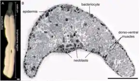 The bacteriocyte cytoplasm is abundant in glycogen and contained some electron-dense, round-shape granules.[2] Mitochondria and the rough endoplastic reticulum is low in number. Throughout the anterior trophosome region, the nuclei were mainly oval but irregularity in the shape of the nuclei is observed in the posterior trophosome region.[2] The cell wall of the symbionts composed of an outer membrane and a cytoplasmic membrane typical of gram-negative bacteria.[5] Symbionts were often embedded separately in the symbiosome membrane adjacent to the bacterial cell wall except when they are proliferating.[2] In such case, proliferating symbionts are frequently found in the anterior trophosome region.