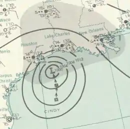 In advance of Cindy's arrival, a hurricane watch was issued between Freeport, Texas and Grand Isle, Louisiana on 16 September. The New Orleans Weather Bureau office imposed a hurricane warning between Galveston, Texas and Vermilion Bay, Louisiana three hours later, and additionally replaced the earlier hurricane watch with a gale warning. After making landfall on the morning of 17 September, the hurricane warning for Cindy was discontinued, though flood warnings and small craft warnings remained in effect for coastal areas of southeastern Texas.[2] Mandatory evacuations were ordered for low-lying areas along a 300 mi (480 km) arc, and five buses were sent to help in evacuation efforts in Sabine County, Texas. Meanwhile, the Texas civil defense and disaster relief agency and other related organizations prepared for the storm as governor of Texas John Connally declared a state of emergency.[5] In Cameron Parish, Louisiana, approximately 5,000 individuals left the area prior to the storm,[6] while 6,000 fled in the state as a whole; in neighboring Texas, 3,600 individuals living along the state's shoreline heeded the Weather Bureau's warnings, evacuating to higher ground.[2] Emergency shelters opened along the Gulf Coast, with 1,500 taking refuge in Port Arthur, Texas, 525 in Beaumont, 1,078 in Galveston,[7] 300 in Port Bolivar, and 475 total in Texas City, Hitchcock, and Lamarque.[8] A state of emergency was declared in the city of Lake Charles, Louisiana, where officials prepared to feed up to 10,000 refugees as the Salvation Army and other relief agencies' volunteers were deployed to the region.[7]