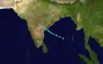 The monsoon trough spawned a tropical depression on June 4 in the Arabian Sea. It tracked due eastward, becoming a tropical storm later that day and reaching a peak of 60 mph winds on the 6th. The storm turned abruptly northward, turned westward and executed an anticyclonic loop. Vertical shear caused the system to dissipate on the 12th.