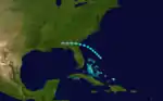 A tropical wave developed into a tropical depression on September 2, while located near Guadeloupe.[3][4] Early on September 3, the system became a tropical storm. It oscillated slightly in intensity during the next few days, while brushing Puerto Rico and north coast of Hispaniola. By September 5, the storm headed northward toward the southeastern Bahamas. The system crossed Mayaguana and began curving northwestward. Early on September 7, the storm strengthened into a Category 1 hurricane on the modern-day Saffir–Simpson hurricane wind scale, while curving just north of due west. After intensifying into a Category 2 hurricane later that day, the hurricane struck Long Island and Exuma. Around 12:00 UTC on September 8, the storm strengthened into a Category 3 hurricane, shortly before striking Andros. After clearing the Bahamas, the hurricane strengthened into a Category 4 hurricane early the following day. It intensified further over the Straits of Florida and peaked with maximum sustained winds of 150 mph (240 km/h) and a minimum barometric pressure of 927 mbar (27.4 inHg) at 06:00 UTC on September 10. Hours later, the system made landfall in Dry Tortugas, Florida. The storm weakened while crossing the Gulf of Mexico and fell to Category 3 intensity around 12:00 UTC on September 12. However, early the following day, it re-strengthened into a Category 4 hurricane. While approaching Texas, the system began to weaken again, deteriorating to a Category 3 hurricane on September 14. Later that day, it made landfall in Kenedy County with winds of 115 mph (185 km/h). The storm weakened while moving inland and dissipated near El Paso on September 16.[4]
