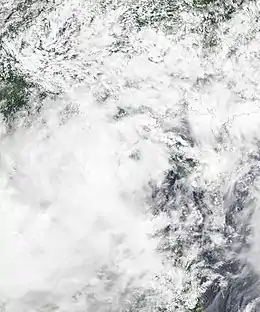 On the following day, July 31, the Japan Meteorological Agency (JMA) designated the invest as a tropical depression.[6] In a favorable environment of low vertical shear, excellent equatorial outflow and 31 °C sea surface temperatures,[2] the depression continued to organize, and by the next day, the JMA upgraded depression to a tropical storm, naming it Sinlaku.[7] The JTWC would later follow suit, upgrading the monsoon depression to tropical storm status.[8] Sinlaku would later not intensify further, although the JMA said the storm's pressure lowered to 992 hPa (29.29 inHg).[9] The storm would later make landfall on northern Vietnam,[10] and both agencies issued final advisories on Sinlaku.[11][12]