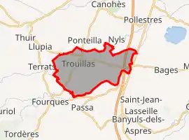 Trouillas is located in the canton of Les Aspres and in the arrondissement of Perpignan.