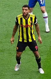 On 4 August 2010, Deeney handed in a written transfer request amid interest from several Championship clubs. He had been told he was to leave Walsall earlier in the summer, and had slackened his pre-season training in protest at the club's hardline stance when trying to sell him.[5] He signed for Watford two days later for an initial fee of £250,000 rising up to £500,000 on a two-year contract that lifted his salary from £1,200 to £6,000 a week.[5] Walsall also negotiated a 20% sell-on fee for any profit were Watford to sell him in the future, something that later would complicate potential transfers away from the club according to Deeney in 2018.[15] On the same day Deeney signed for Watford, he played a part in their 3–2 win against Norwich City on the opening day of the season, coming on for Marvin Sordell in the second half.[16] Deeney found his poor pre-season meant he struggled for fitness in comparison to his new teammates.[5] He scored his first Watford goal against Notts County in the first round of the League Cup on 24 August.[17] Deeney went on to make 40 appearances for Watford in his first season, scoring three goals from 20 starts, although he was mainly deployed on the wing by Malky Mackay.[18]