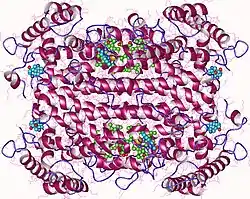 Tryptophan 2,3-dioxygenase is a heme-containing cytosolic enzyme encoded by gene TDO2.[5] Crystallographic studies of Xanthomonas campestris TD)[13] and Ralstonia metallidurans TDO)[16] have revealed that their structures are essentially identical and are intimately associated homotetrameric enzymes.[17] They are best described as a dimer of dimers because the N terminal residues of each monomer form part of the substrate binding site in an adjacent monomer. The proteins are completely helical, and a flexible loop, involved in L-tryptophan binding, is observed just outside the active-site pocket. This loop appears to be substrate-binding induced, as it is observed only in crystals grown in the presence of L-tryptophan.[17]