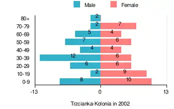 According to the 2002 Poland census, there were 100 people residing in Trzcianka-Kolonia village, of whom 48% were male and 52% were female. In the village, the population was spread out, with 28% under the age of 18, 34% from 18 to 44, 22% from 45 to 64, and 16% who were 65 years of age or older.[2]
