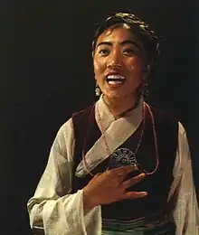 Tseten Dolma (Tibetan: ཚེ་བརྟན་སྒྲོལ་མ།, Wylie: tshe brtan sgrol ma, ZYPY: Cêdain Zhoima, Lhasa dialect: [t͡sétɛ̃ ɖø ̀ːma]; Chinese: 才旦卓玛; pinyin: Cáidàn Zhuōmǎ) is a Tibetan soprano. She was born August 1, 1937 to a serf [1] family in Shigatse, Tibet. Tseten was influenced by Tibetan folk music from a very young age, and first performed on stage in 1956. She is known for starring in the 1965 musical epic The East Is Red.