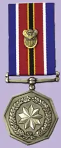 The Tshumelo Ikatelaho - General Service Medal was instituted by the President of the Republic of South Africa on 16 April 2003, and came into effect on 27 April 2003. It can be awarded to all ranks who have participated in military campaigns or operations which, while not warranting the institution of particular campaign medals, still justify the award of a medal for general service.[1][2] The bilingual title of the medal is in isiNdebele and English
