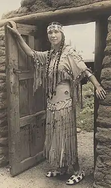 Tsianina Redfeather was born Florence Tsianina Evans at Eufaula, Muscogee Nation, in Indian Territory (now Oklahoma), to Muscogee parents.[1] She began training at the age of 14 in Denver, Colorado, sponsored in part by Alice Robertson.[2][3] While training in Denver, Tsianina becomes a mezzo soprano virtuoso and meets Charles Cadman, an American Pianist, who later becomes her partner in touring and performing across the globe.[3]