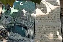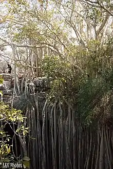 Continuing past the baobabs, the trail leads to the Banyan Tree site. This is a classic vertical sink hole, about 25 m in circumference resulting from the collapse of a cave. About 10 to 12 m below the rim of the sink hole is a pool and growing at the edge of the sinkhole, with roots reaching down into the water is a large banyan fig tree. Fossils have also been found here, showing a cross-section of the known extinct fauna found in the region.[11]