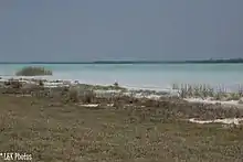 The lake is in a shallow basin and the area covered by water shrinks dramatically in the dry season, resulting in extensive exposed hypersaline flats. Glasswort (Salicornia pachystachya or Arthrocnemum pachystachyum) and other salt-tolerant plant species such as the golden leather fern (Acrostichum aureum) move onto the flats as the water levels recede. The introduced species beach sheoak (Casuarina equisetifolia) can be found in small stands along the east shore[17] as well as a narrow band of Salvadora angustifolia trees.[18]