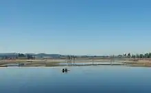 Wapato Lake Unit is located about 15 miles (24 km) to the west of the main refuge, near the city of Gaston along Oregon Route 47 in Washington and Yamhill counties.[16][37] The area was once the site of Wapato Lake, whose soil held an organic-rich peat that sustained a shrub swamp ecosystem. The wapato plant (Sagittaria fasciculata) grew in the upper marsh of the Wapato Lake Basin and was harvested by Native Americans.[33][38] In 1892, attempts began to drain the 800 acres (320 ha) lake to increase farmland,[16][39] with the Wapato Improvement District completing the effort in the 1930s.[40] Valley forests, prairies, and wetlands encompass the region today,[33] including two small streams, Ayers and Wapato creeks.[41]
