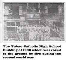 In was in 1923 when the priests acquired the house of Don Urbano Dacanay for P1,000 pesos, west of the plaza, and housed in it the newly founded Tubao Catholic High School. It was named the Msgr. Martens Building. This building was destroyed in World War II during the liberation from the Japanese occupation. In January 1951, Father Albert Van Nuffelen sold the lot back for P1,800 pesos to the relatives of the former owner viz., Mr. Bernardino Madriaga and Milagrina Oller who built their house on it.[12]