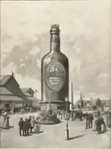 The Tuborg Bottle was originally constructed as Tuborg Breweries' contribution to the Nordic Exhibition of 1888 in Copenhagen and it was then located where Copenhagen City Hall stands today. Tuborg was the first Danish brewery to market bottled beer as an alternative to the traditional beer barrels.[1] The structure was designed by the architect Viggo Klein and executed by the theatrical painter Carl Lund. Denmark's first mechanical lift transported visitors up to the observation platform. The lift was operated by the water pressure from Copenhagen Waterworks through a system of stamps and pulleys.[2] The top of the bottle was after dark illuminated by electrical lights.[2]