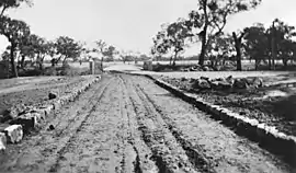 In April 1881, 57 town lots were offered for sale in the town of Tuen "at the junction of Warrego River and Tuen Creek" with prices starting from £8 per acre.[4] Some lots were sold as 20 of them were owned by Margaret Heuston at her death in 1910.[5] Her husband Robert Heuston operated the Tuen Hotel beside the Barringun Road until at least 1913, after which it may have been operated by the Gwydir family.[6] In 1925, the hotel was taken over by retired policeman Robert Winterburn until at least 1934.[6][7] There is no evidence the hotel was operating in the 1940s.[6]