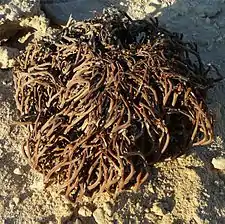 In the family Amaranthaceae s.l. (i.e. broadly defined to include Chenopodiaceae), several annual species of the genus Kali are tumbleweeds. They are thought to be native to Eurasia, but when their seeds entered North America in shipments of agricultural seeds, they became naturalized in large areas. In the cinema genre of Westerns, they have long been symbols of frontier areas. Kali tragus is the so-called "Russian thistle". It is an annual plant that breaks off at the stem base when it dies, and forms a tumbleweed, dispersing its seeds as the wind rolls it along.[7] It is said to have arrived in the United States in shipments of flax seeds to South Dakota, perhaps about 1870.[8] It now is a noxious weed throughout North America, dominating disturbed habitats such as roadsides, cultivated fields, eroded slopes, and arid regions with sparse vegetation. Though it is a troublesome weed, Kali tragus also provides useful livestock forage on arid rangelands.[9]