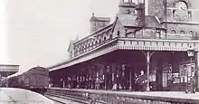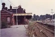 The original two-road locomotive shed (code number 75F) was capable of accommodating six engines and situated to the south of the station. It was opened in 1866[8] and replaced in 1891 by a larger four-road shed located to the north-west of the station.[9] Following bomb damage on 20 November 1940 during the Second World War, the slate roof of the engine shed was replaced with corrugated asbestos.[10] It was closed to steam locos in June 1965 but the tracks were used for storage of engineers rolling stock until the late 1970s when they were removed.